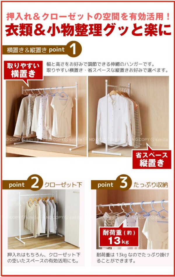 【商品説明】 押入れ、クローゼット等で幅広く活用できて 横置き&縦置き自在のハンガーラックです。